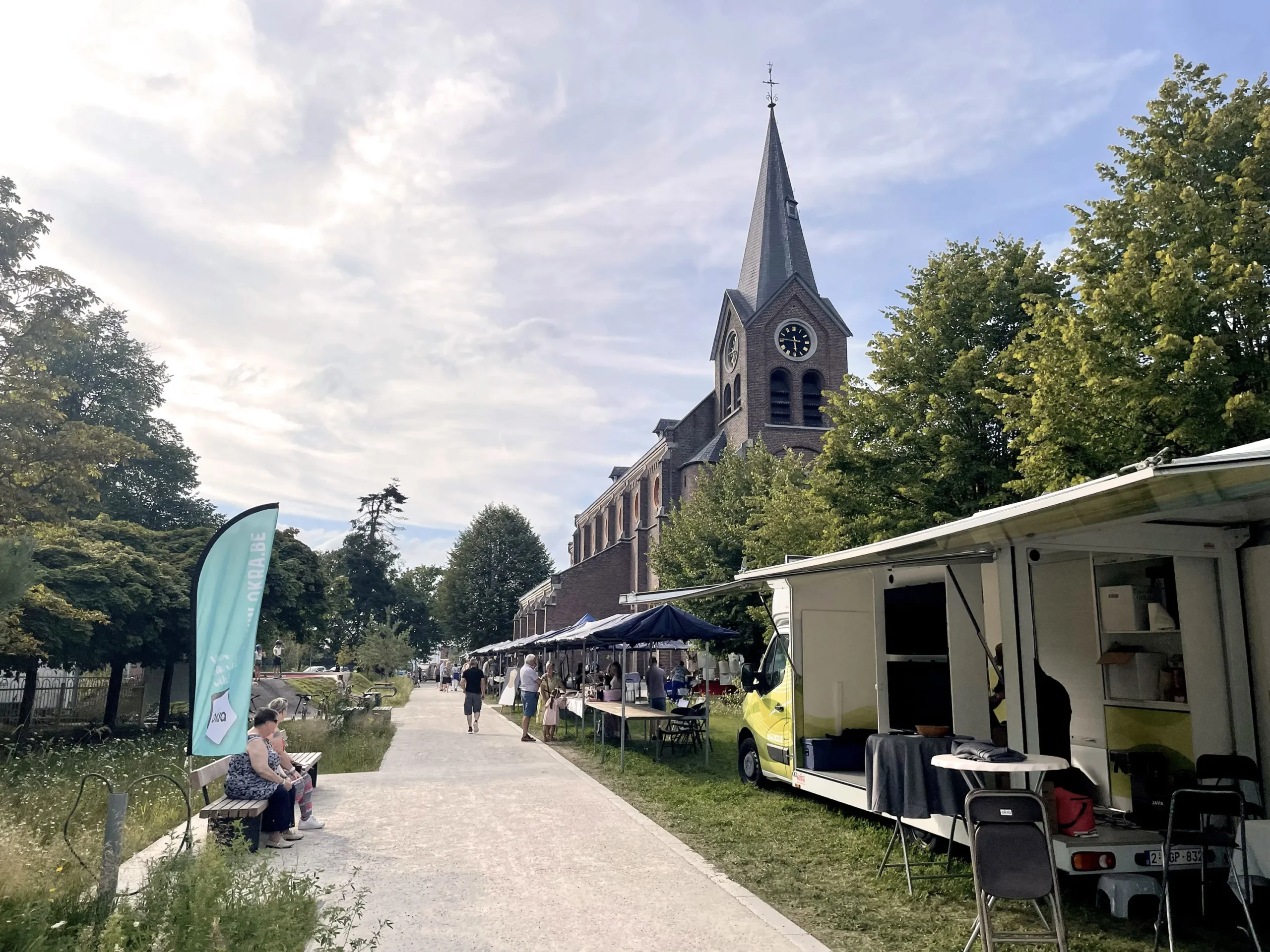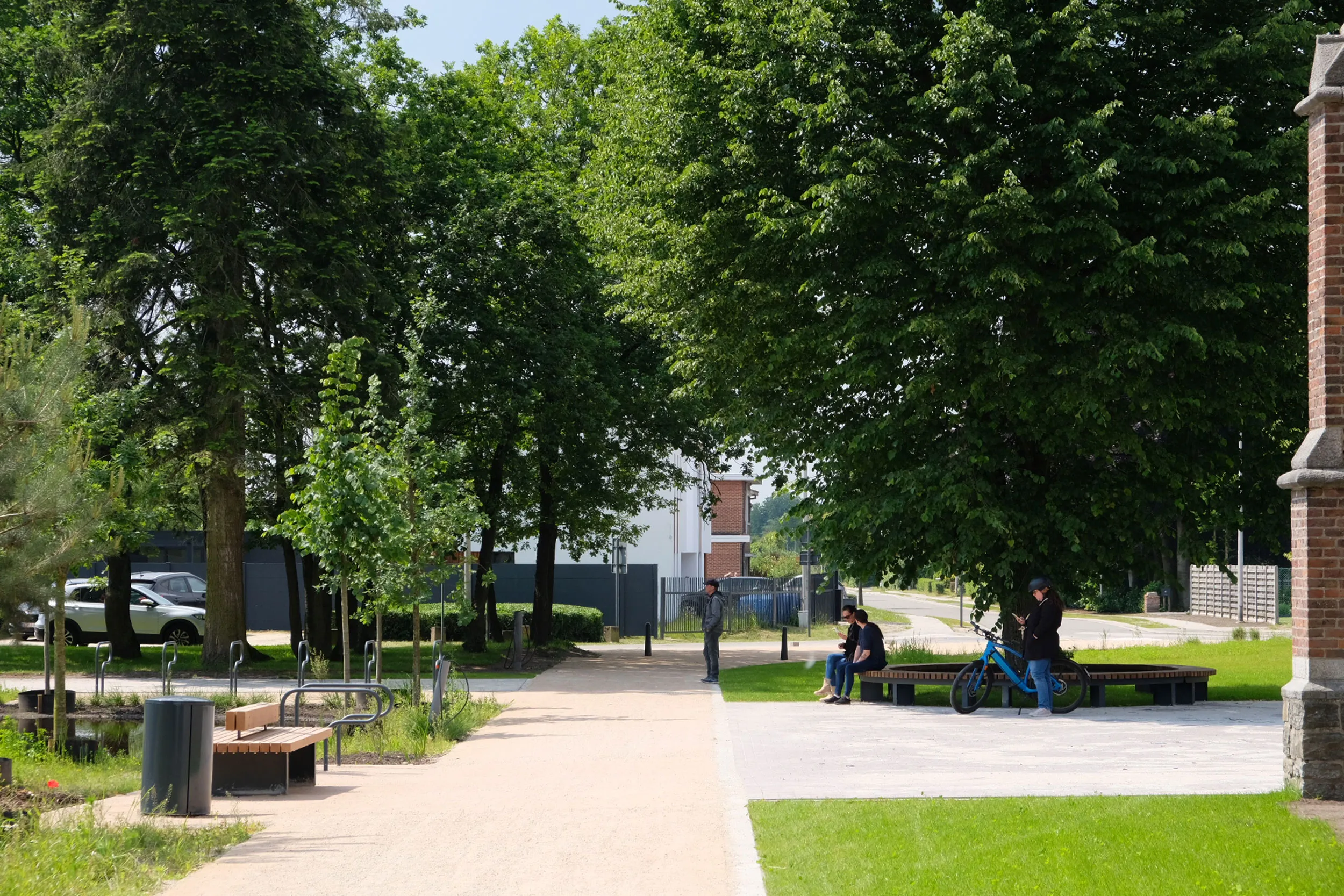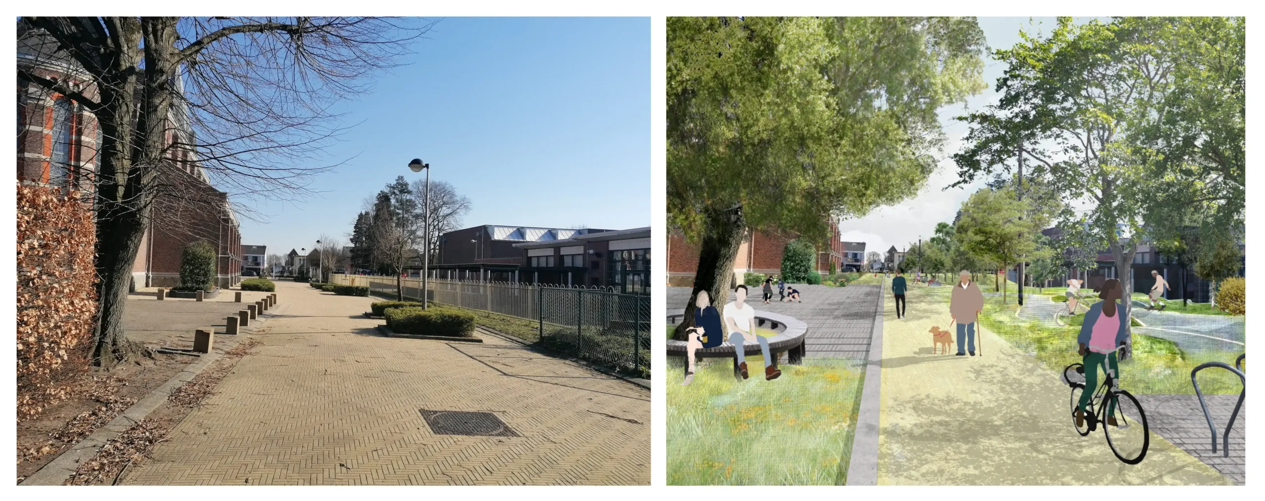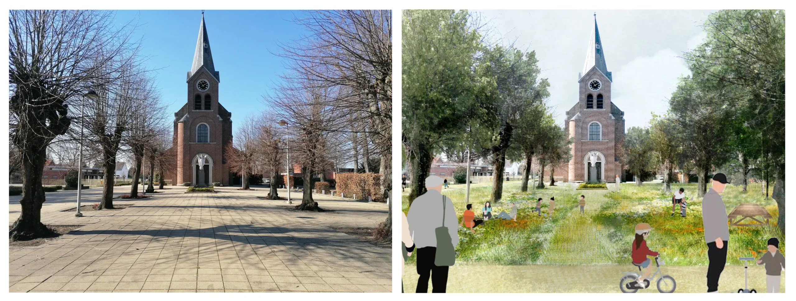 Le réaménagement des espaces public du Kom à Lommel transforme un espace majoritairement minéral en un parc adapté au changement climatique et renforcé dans ses usages. C’est un exemple de projet de petite envergure, mis en oeuvre de façon rapide et efficace. Le processus de travail a débuté par une approche paysagère et urbaine à grande échelle ainsi que par une consultation des riverains et des services communaux. Cela a permis de définir une vision pragmatique, partagée et durable de futur des abords de l’église. Sur cette base solide les dessins techniques ont pu être élaborés rapidement et le projet se dérouler de façon fluide.