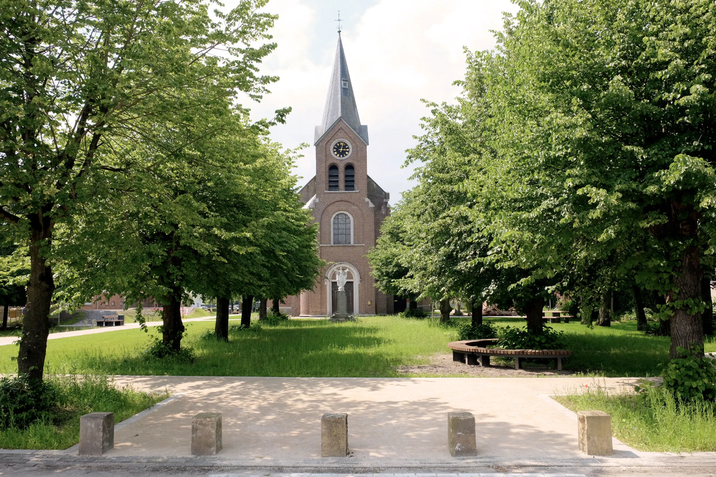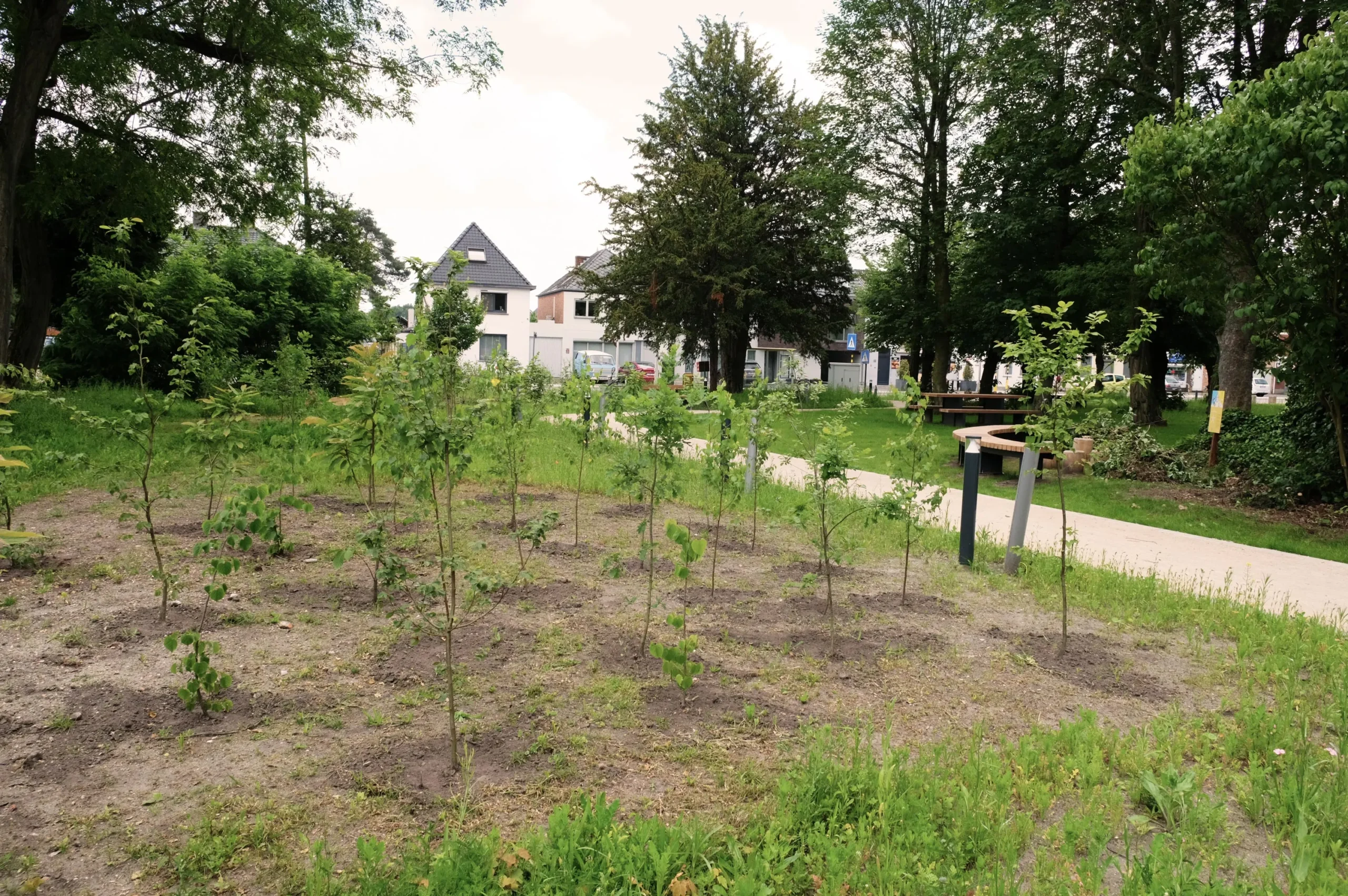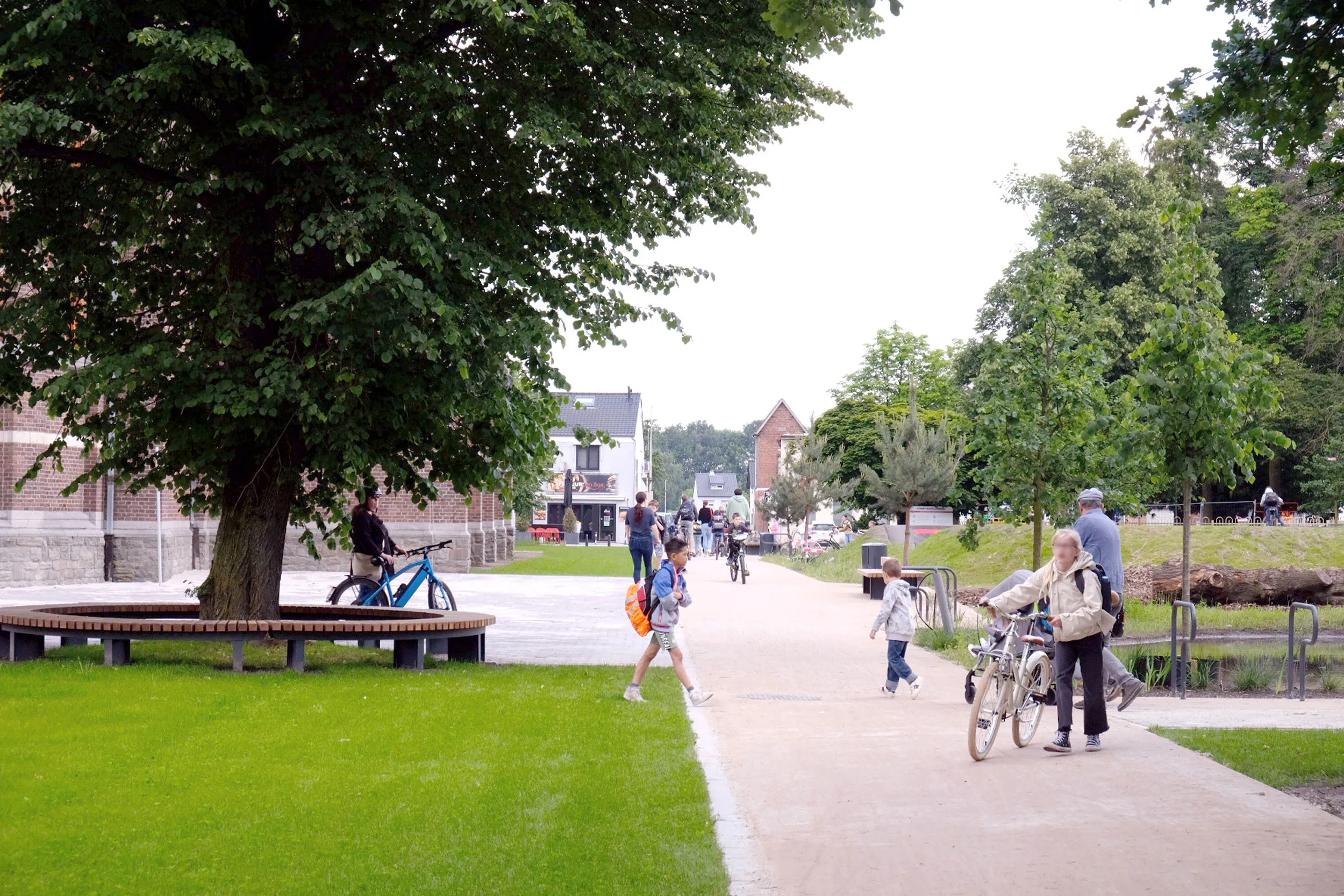 Le réaménagement des espaces publics du Kom à Lommel répond à un défi contemporain majeur : métamorphoser une place de village minérale et délaissée en un cœur de quartier vibrant, capable de répondre activement à l’urgence climatique.