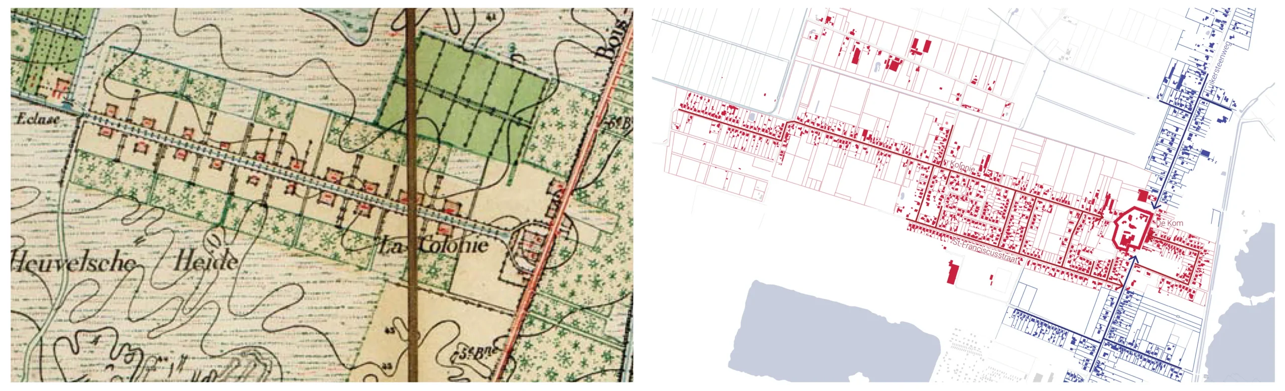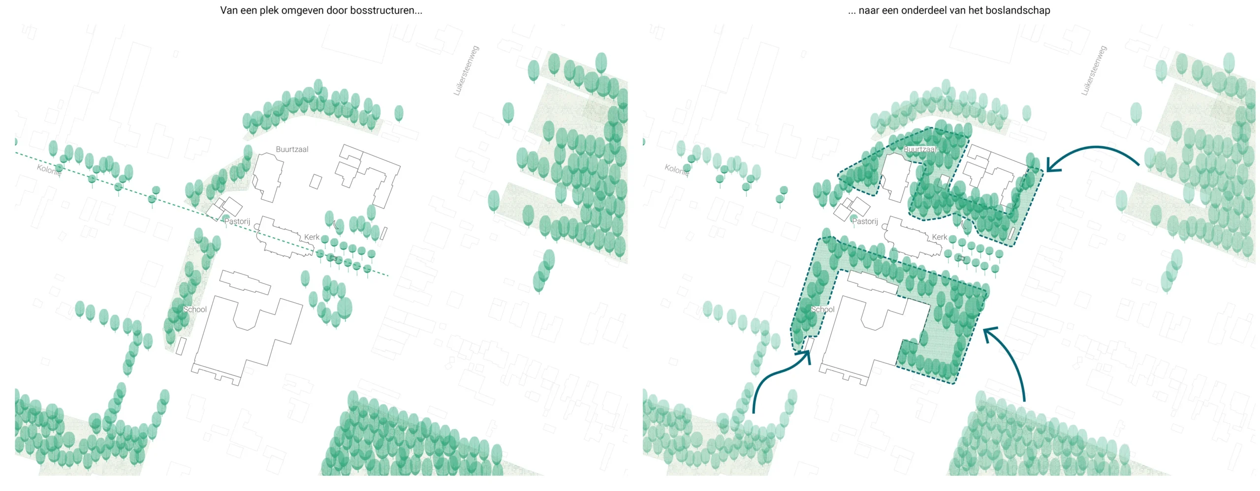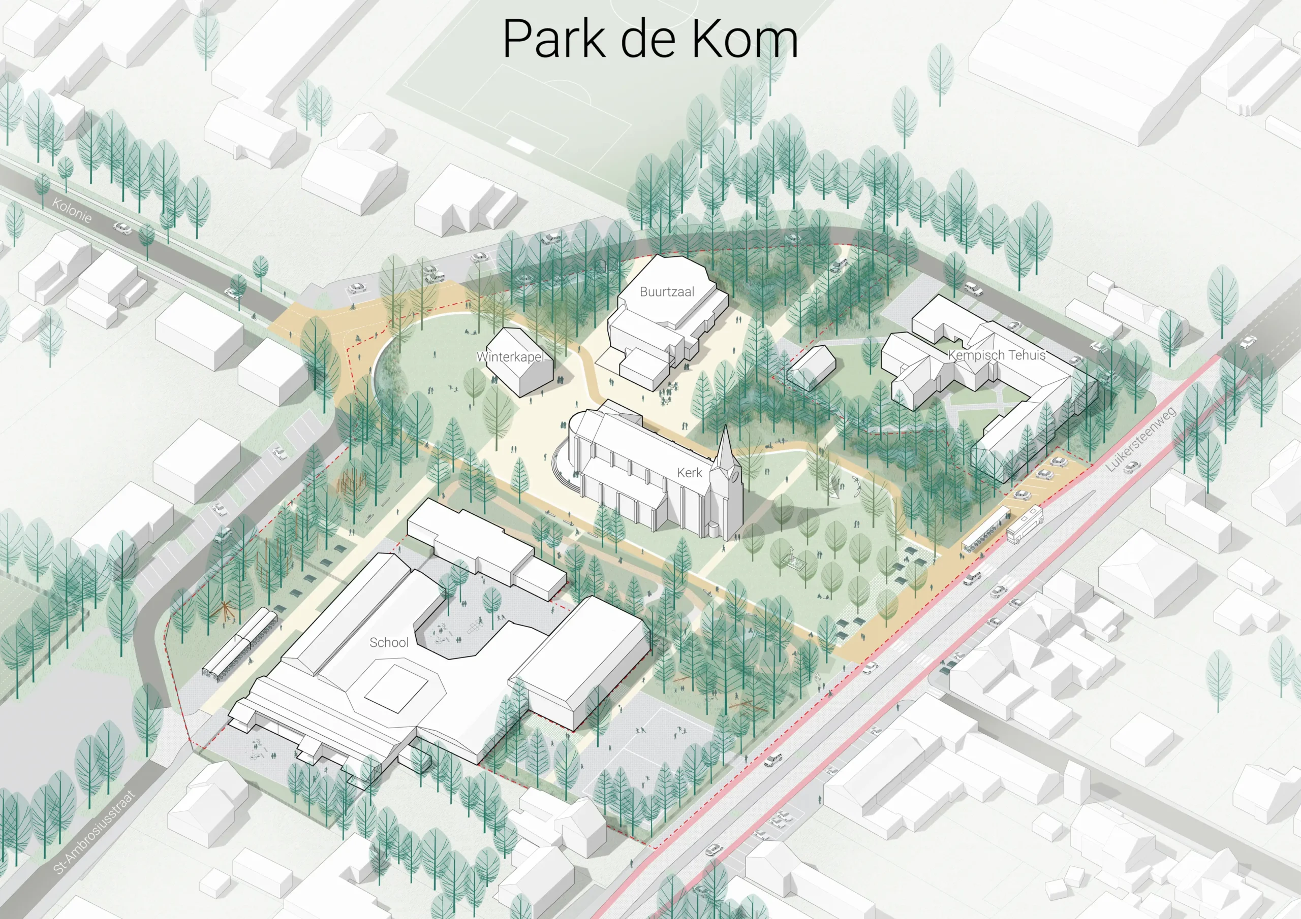 Le quartier De Colonnie est situé à l’écart des grandes structures urbaines. Il a été construit à l’époque de la conquête de ces territoires marécageux, avec la volonté de créer une communauté villageoise. Le kom en était un lieu stratégique en rassemblant l’école, la salle communale et le lieu de culte. Le quartier est situé à l’écart des grandes structures urbaines plus récentes, au milieu des forêts et des landes marécageuses. Le réaménagement du Kom vise à renforcer ces singularités. La réorganisation de l’espace repositionne ce lieu comme une centralité pour les habitants. Le dessin de l’espace souligne les formes historiques et réouvre les perspectives principales. La renaturation renforce l’ambiance forestière de façon à créer des liens d’ambiance et écologique avec le paysage autour. Le nouveau parc du Kom est une clairière dans la forêt de ce grand paysage.