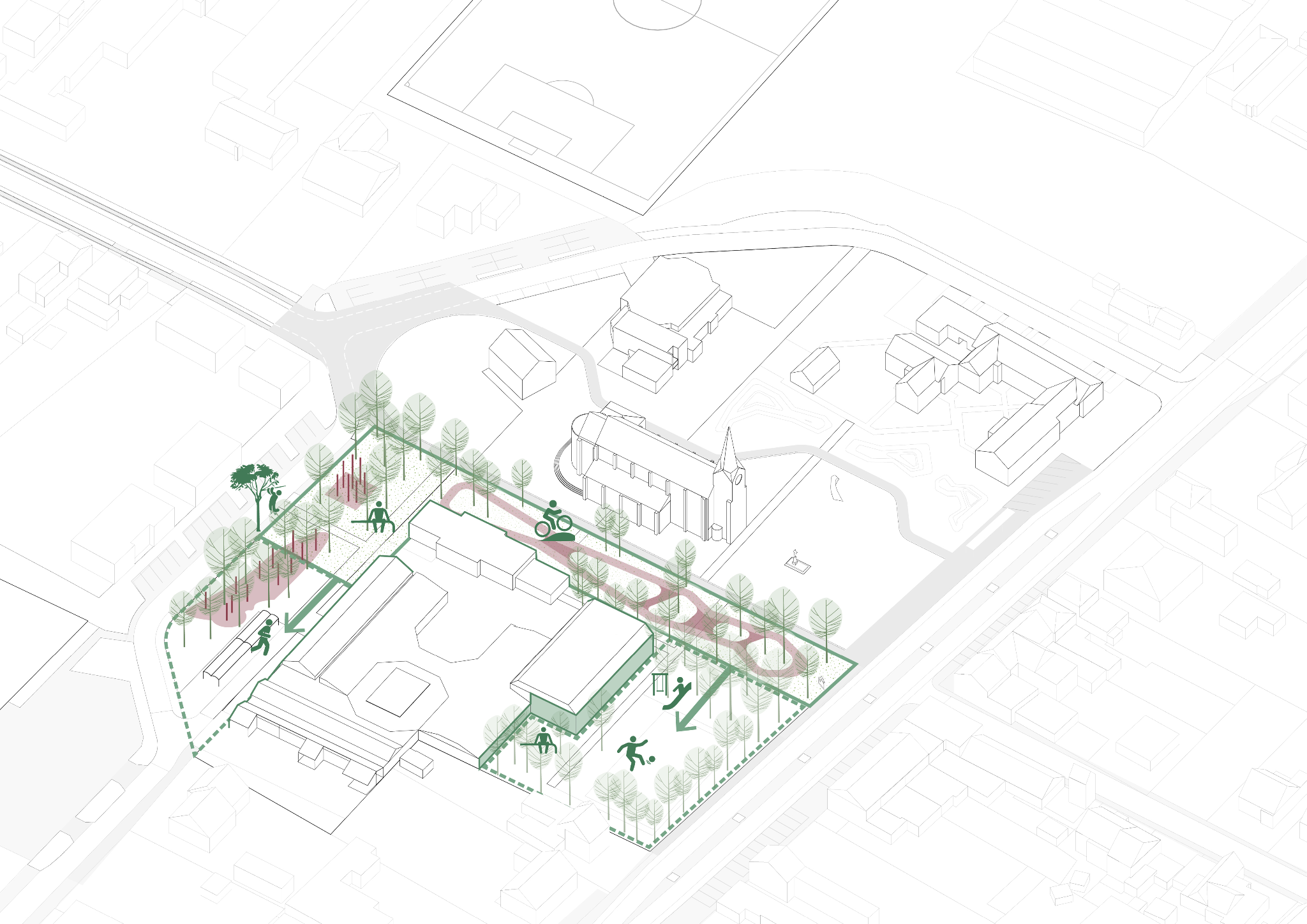 Inspiré par les paysages forestiers emblématiques de la région, le projet dessine une clairière paysagère qui vient enlacer l’ancienne église. Ce nouvel écrin végétal ne se contente pas de structurer l’espace ; il définit un nouveau patrimoine social où l’architecture et la nature dialoguent enfin.